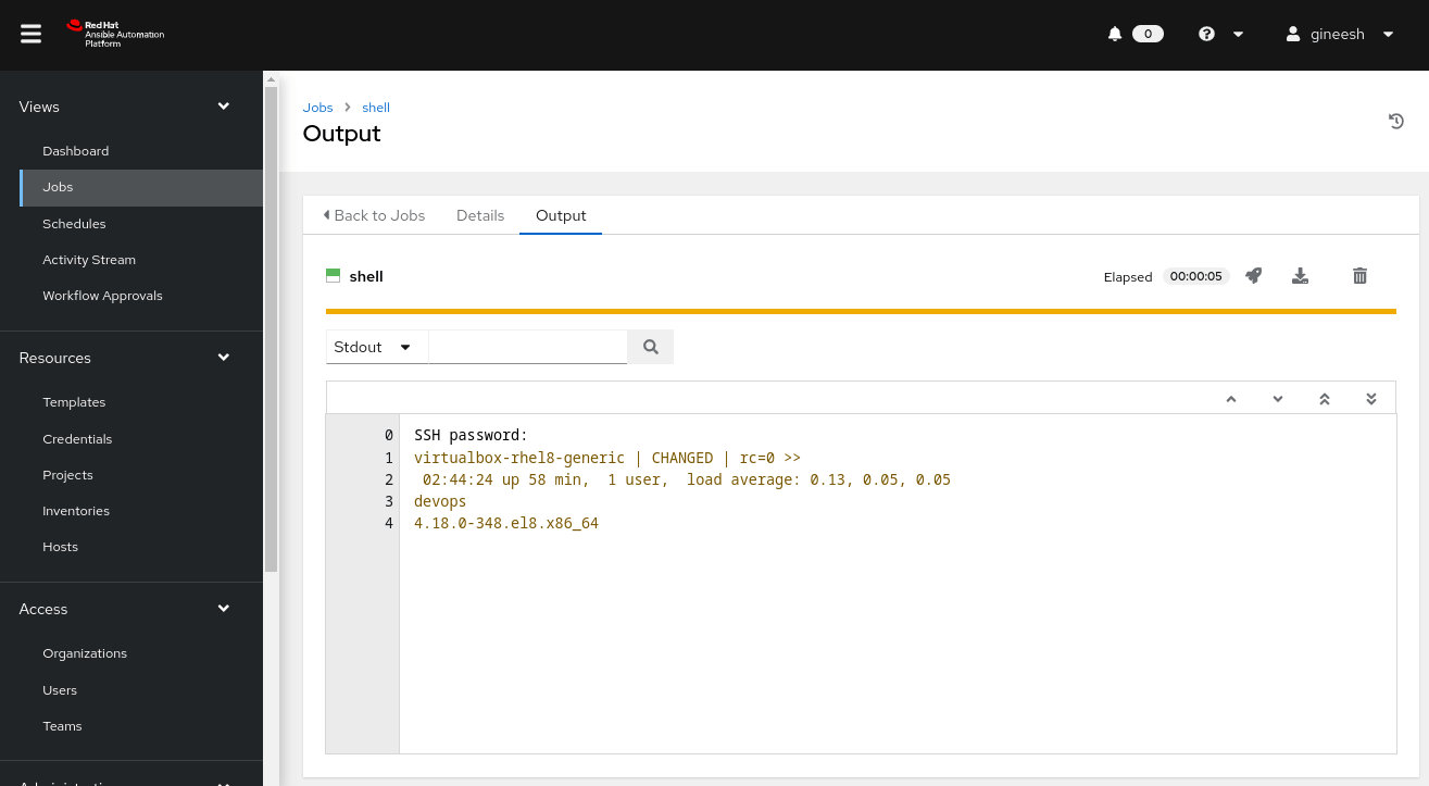 Let us use shell module and execute multiple commands (the argument field) uptime; whoami; uname -r for collecting some system information.
