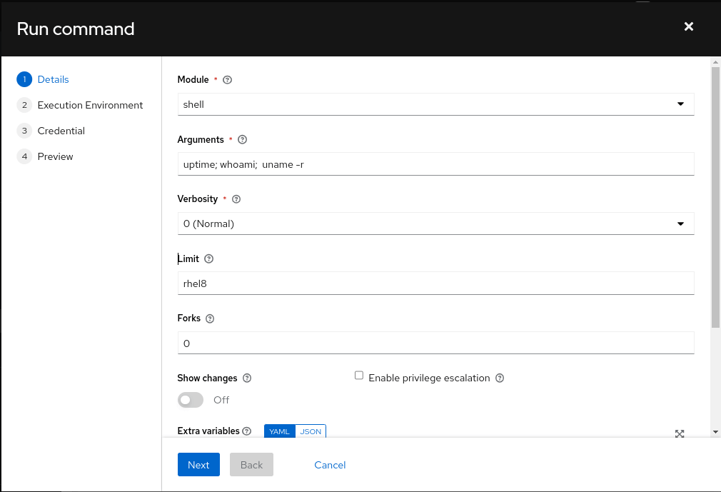 From the Ansible control node, users can easily execute the ad hoc commands as we seen earlier and in this section, we will learn how to execute similar ad hoc commands from an Ansible automation controller WebUI.