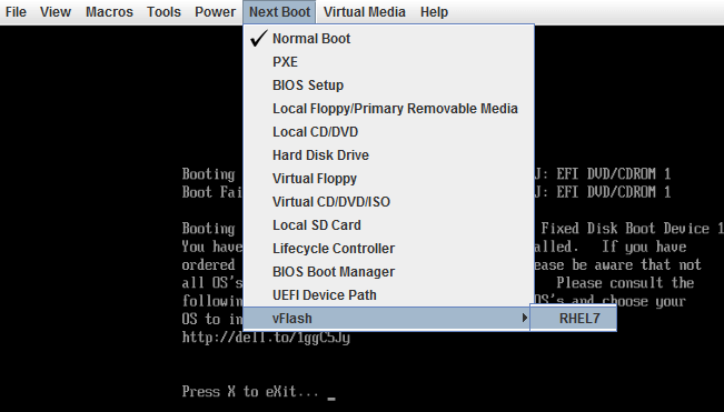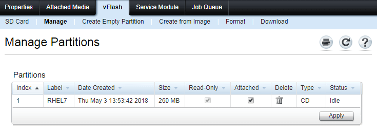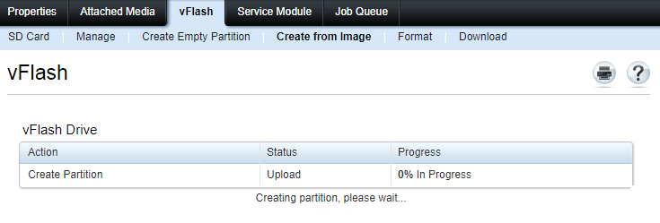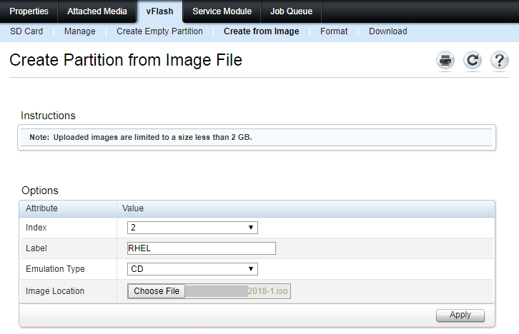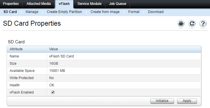 Luckily, we have vFlash media in those PowerEdge servers which we can use as install or boot media. The Dell vFlash media card provides additional functionality to users who already have an iDRAC6 enterprise card. This vFlash media is a 1 or 8 GB secure digital (SD) card that inserts into the iDRAC6 enterprise daughter card on the back of the server; blade servers must be removed from their chassis to access this port. Users can use the space on the vFlash card to create up to 16 partitions in sizes ranging from 1MB to 4GB.