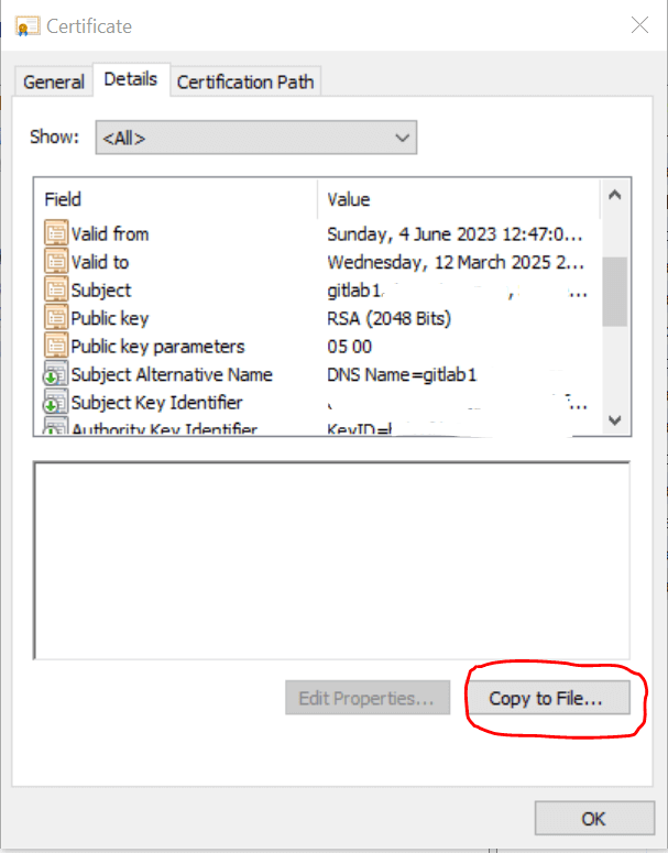 - Copy the obtained certificate to the designated folder within the application configuration directory. For example, GitLab uses /etc/gitlab/trusted-certs/.