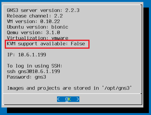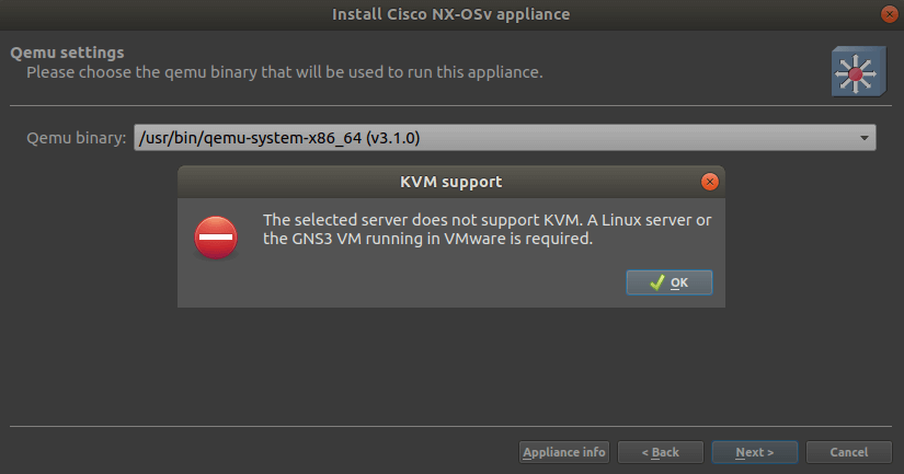 Great, now my GNS3 VM is supporting KVM I can proceed with importing appliance which need KVM support.