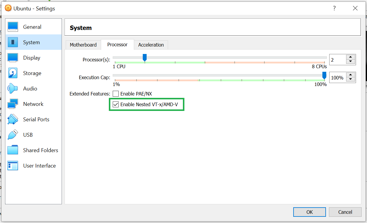 vboxmanage modifyvm Ubuntu --nested-hw-virt on