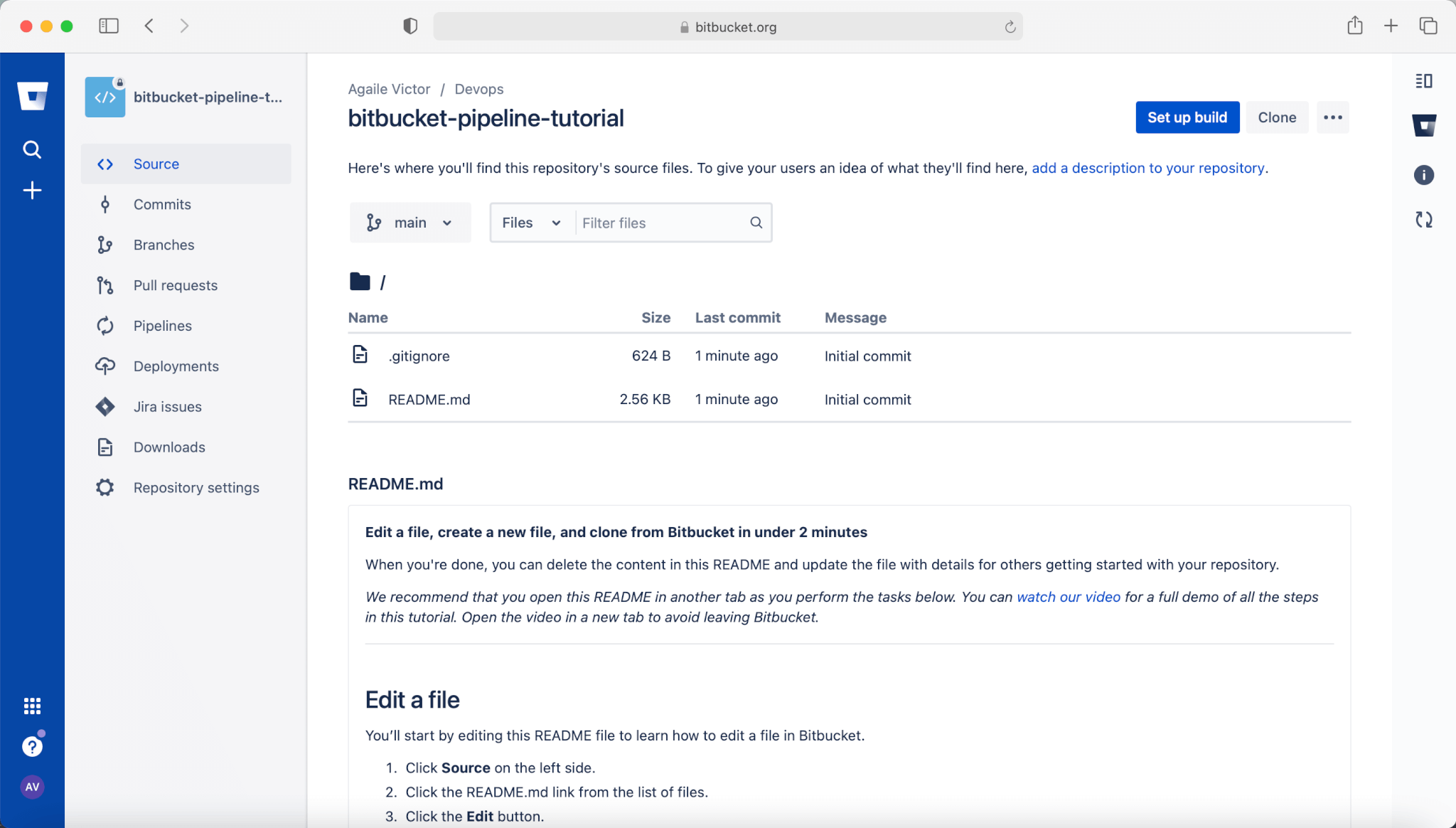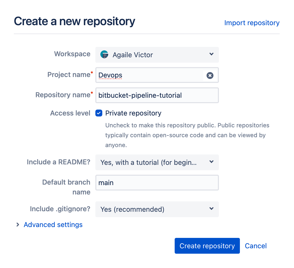 Create a new Bitbucket account if you don’t have one. You can also use your Google, Apple, or Microsoft account to login directly. Now, create a repository to store your code. Click on the Create repository button and give it a name. I’ll name the project “Devops” and the repository name will be “bitbucket-pipeline-tutorial”. Follow the on screen instructions, it’s very simple.