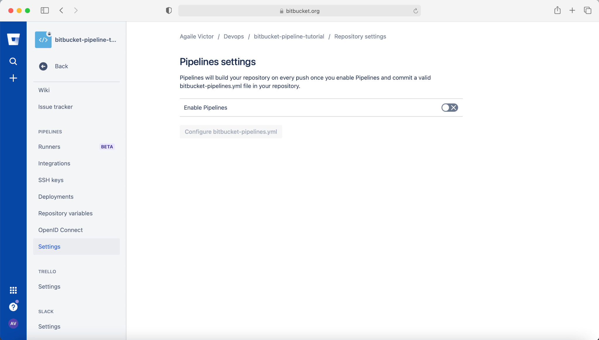 Click Repository settings from the left-hand menu. Scroll down on the left menu to find Settings on the Pipelines section .