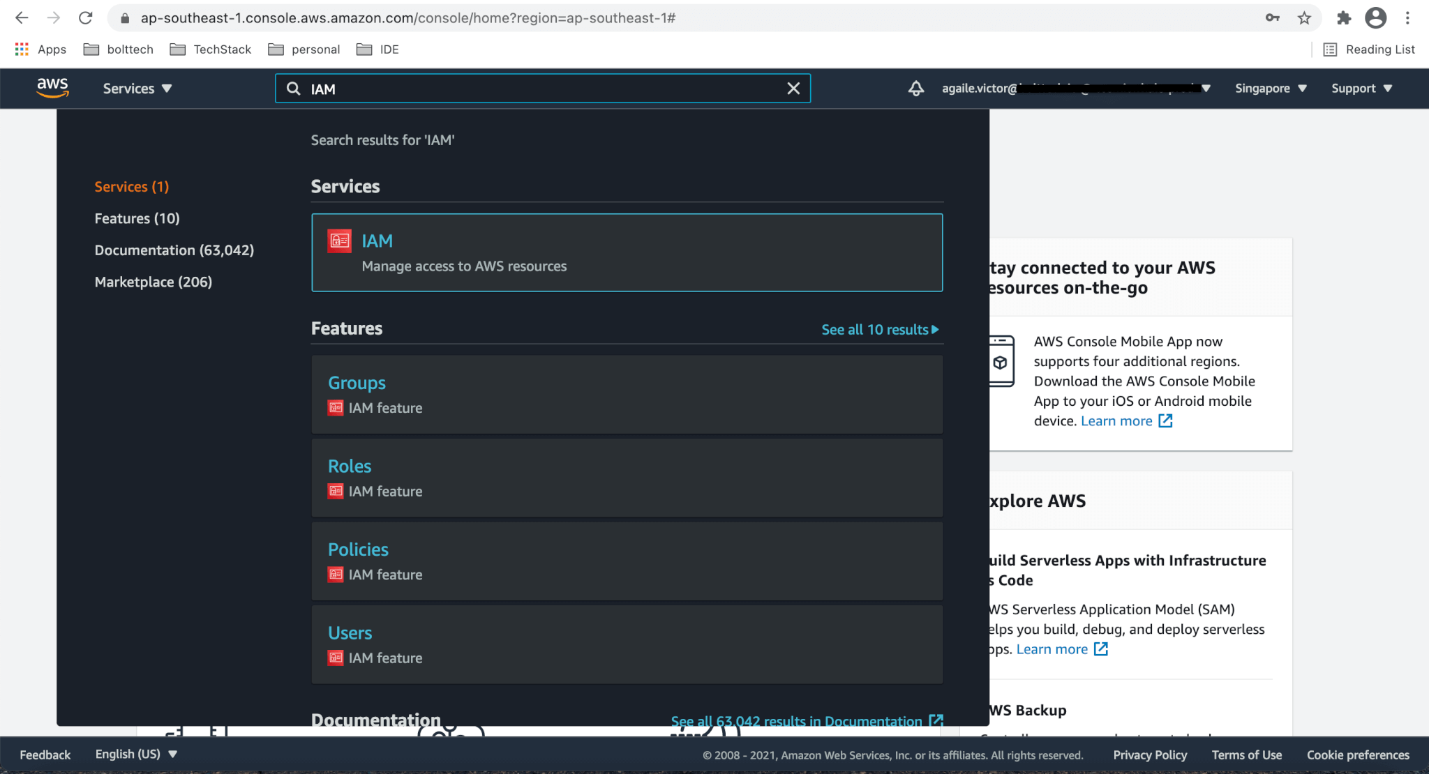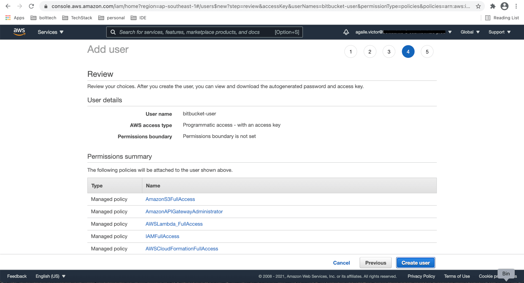 Go to your AWS console . Make sure you’re in the right geographical region as well. Search for “IAM”, under the Find Services heading. Follow the onscreen instructions to add a new user with the following permissions AmazonAPIGatewayAdministrator , AWSLambdaFullAccess , IAMFullAccess , AWSCloudFormationFullAccess , AmazonS3FullAccess