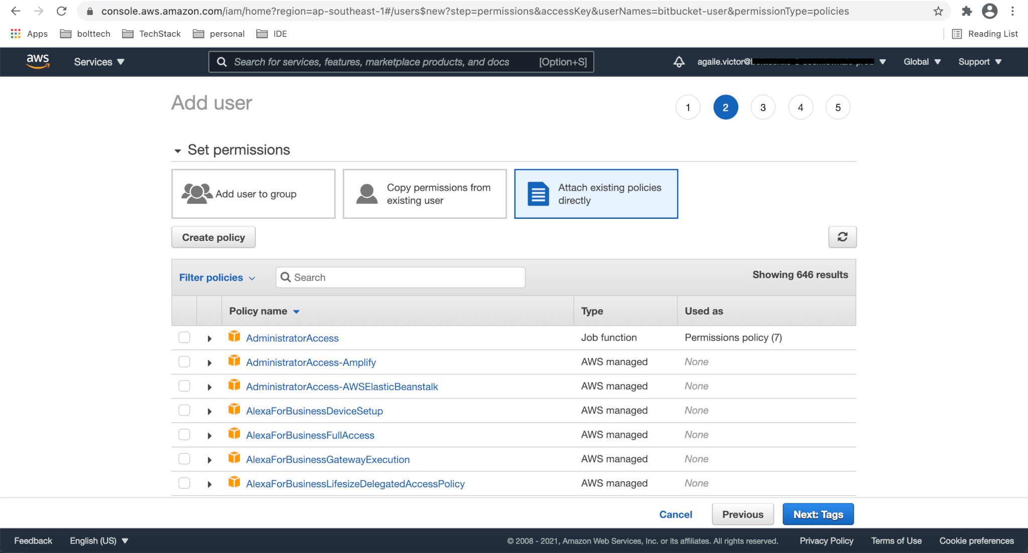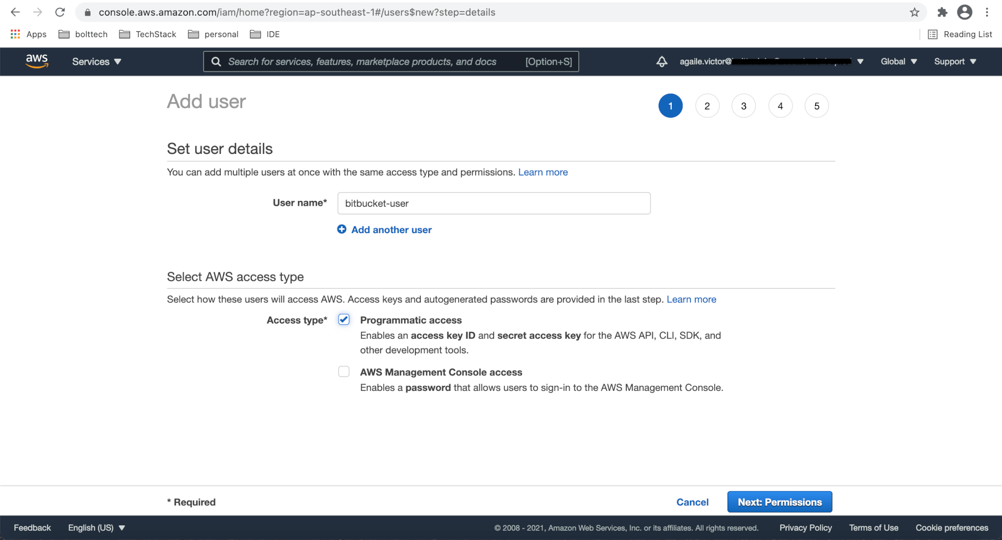 Go back to your AWS console and this time search for s3: Follow the onscreen instructions to create a S3 bucket. Note down the bucket name for future use.