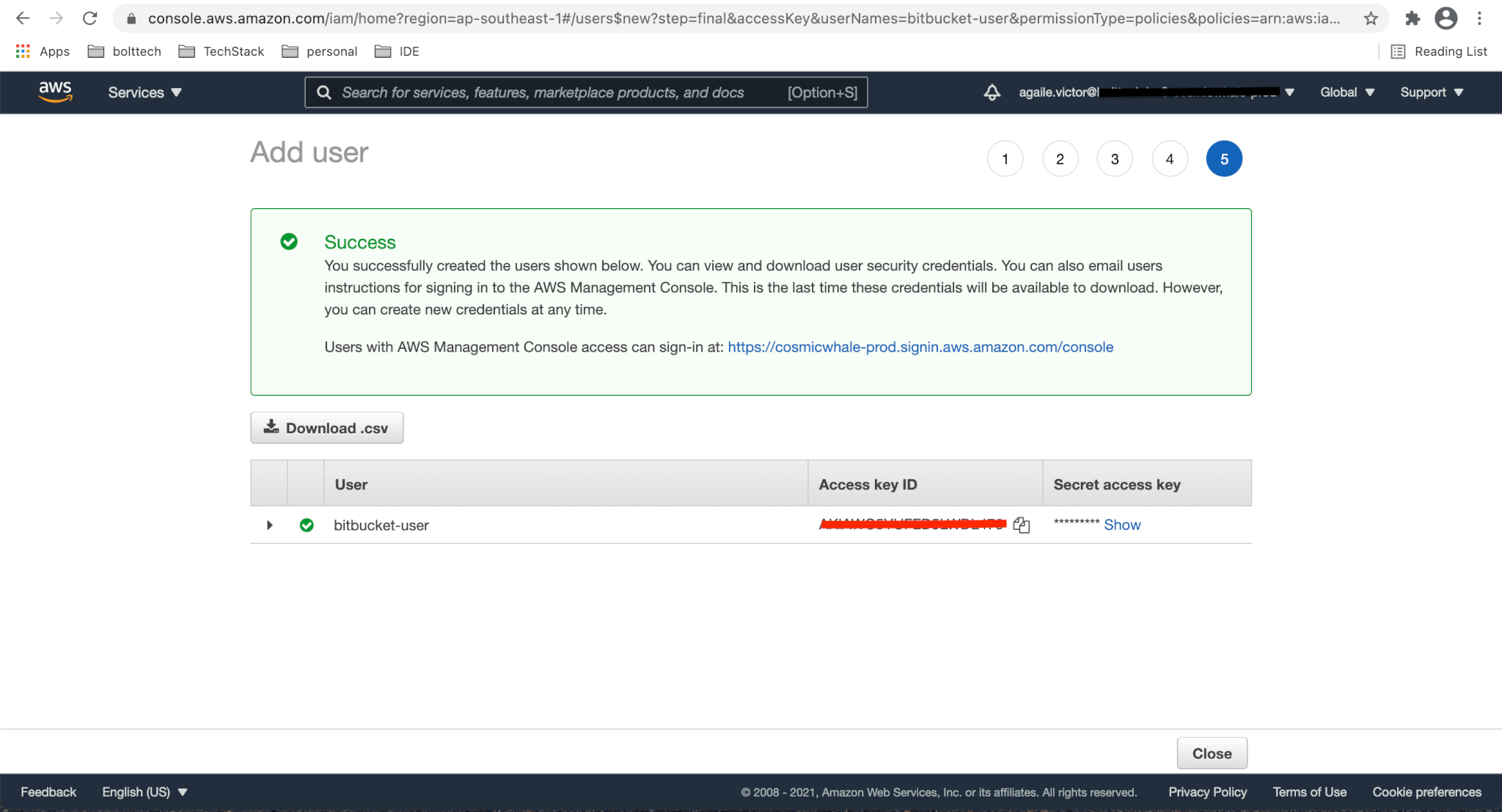 Make sure you download the csv file containing Access key ID and Secret access key and store it somewhere safe.