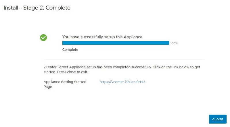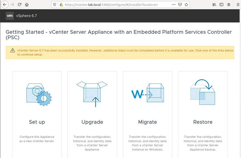 Access your newly installed vCenter on browser and proceed with setup.