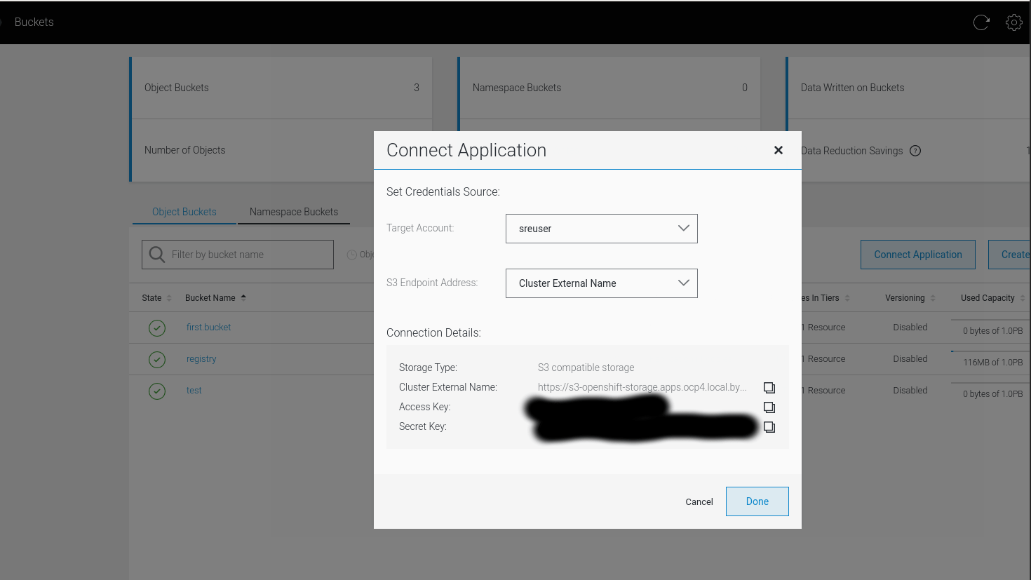 • Obtain NooBaa S3 bucket accesskey and secretkey.