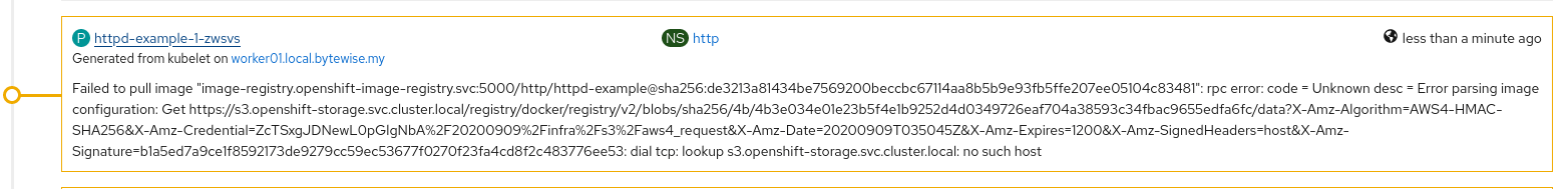 Hint : At this stage the custom root CA is trusted cluster wide, hence when we connecting the registry to the S3 external endpoint (internal service endpoint not possible due to earlier error), the NooBaa S3 route endpoint is using reencrypt termination, thus will trust the replaced ingress certificate.