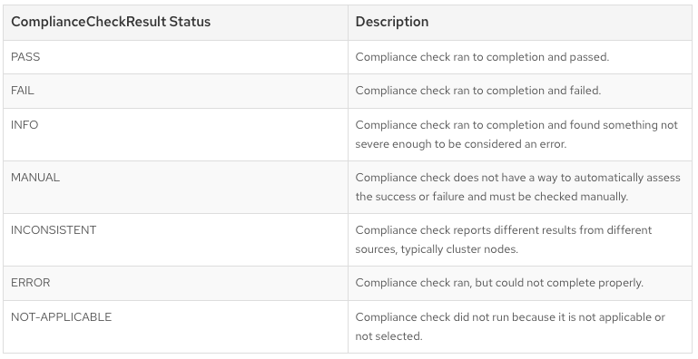 Each result is the output of a compliance rule that it checks. Check the table below to understand the different statuses and their descriptions.