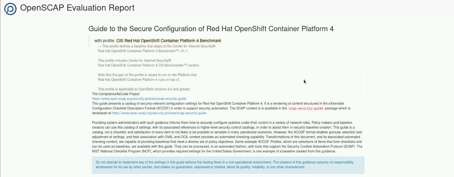 $ oscap xccdf generate report ./cis-scan-results/0/ocp4-cis-api-checks-pod.xml.bzip2 >> ./cis-scan-results/0/cis-scan-results.html