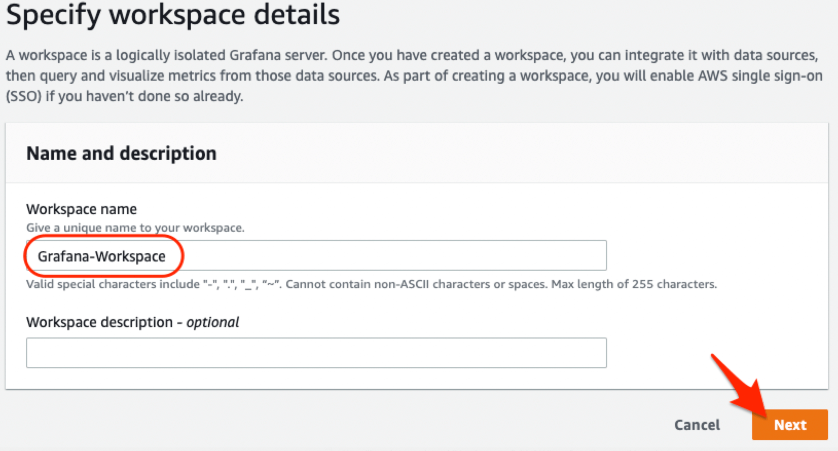 - Enter a workspace name eg. Grafana-Workspace
