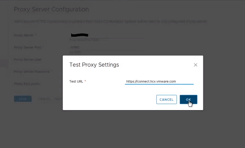 Enter the test url as https://connect.hcx.vmware.com and click ok.